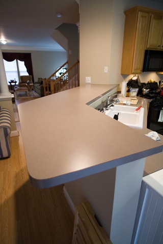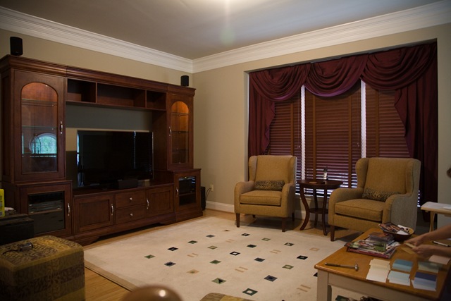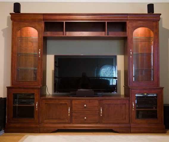 The first project that took us a long time to complete was finding an entertainment center. It took us longer than one might imagine because we wanted a few specific things, including lots of storage space for our DVDs, solid wood construction, and a nice mahogany color. What we settled on is this: