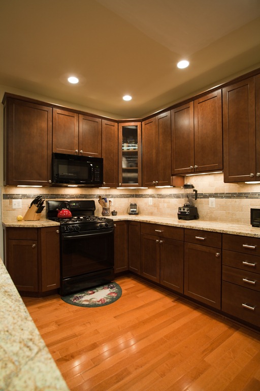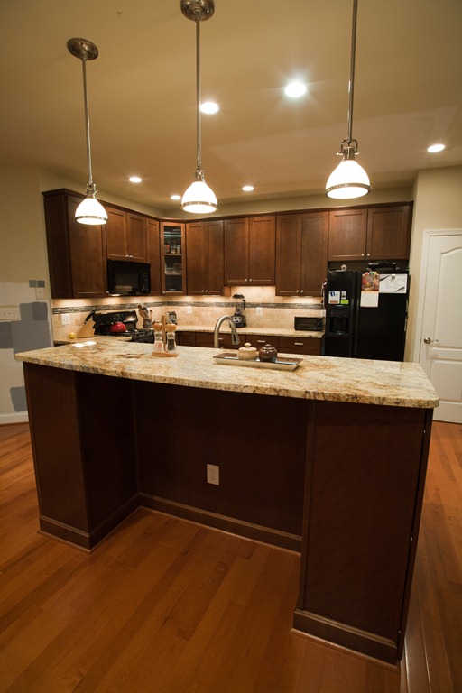 With the pendant lights and the backsplash finally done, we’ve just finished sealing it and we thought we’d share a few pictures. This means that we’re done with renovation – all but the painting, that is. Following are a couple of pictures of the whole kitchen.