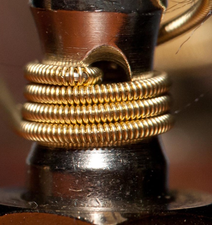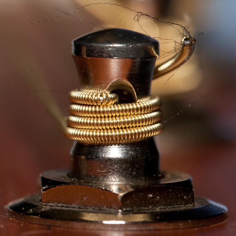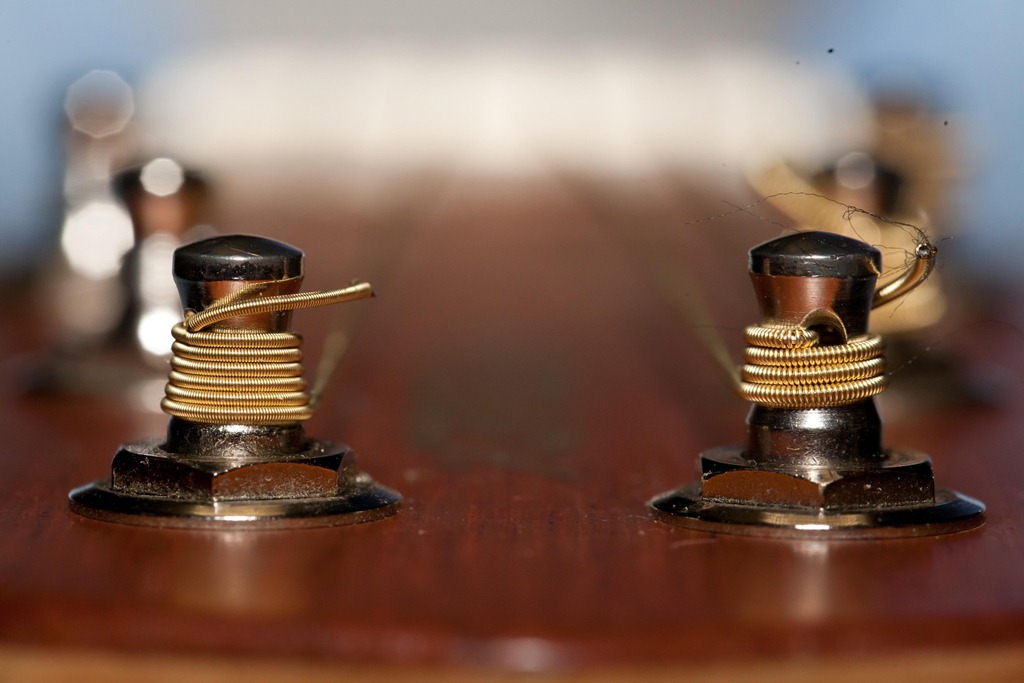 We [and by “we” I mean Laura] found a guy on Craig’s List who posted a ton of Canon photography equipment, most of which we couldn’t afford, but some of the items have been on our list for quite some time. A new 580EX II flash, complete with stand, mounting bracket and umbrella was a great plus, but the big ticket item that we’ve been wanting for a while is a new 100mm F2.8 L macro lens. It’s awesome! We can get some great up-close and personal pictures that are very hard to do with other lenses. So, I took it upon myself to play around a little. Now, I’ve been getting back into playing guitar, so it’s sitting out for me to take pictures of and a guitar makes for good “macro” shots. Here’s a picture taken just a few inches from the end [and yes, that’s a spot of dust on my camera sensor]: