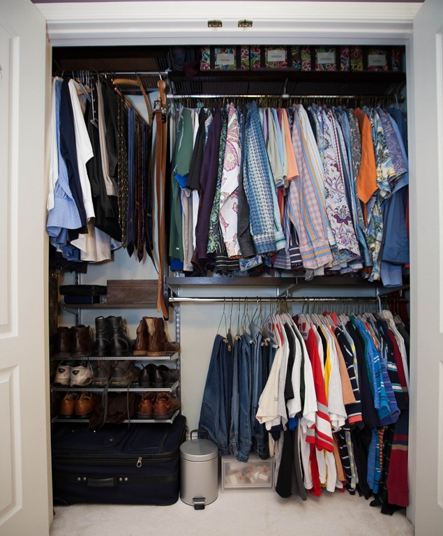 First off, Laura has been bugging me to “re-do” my closet for years. Our master bedroom has two closets, one large [hers] and one small [mine]. We did hers shortly after moving in, and a couple other projects involving the same closet construction parts and process. Now, it was my turn – especially since it seems my excessive quantity of shirts was bending the closet shelf/rod downwards. In my defense, the truth was that it wasn’t a capacity problem, but one of sloppy installation of the old system. I think it was bad when we moved in, but my obtaining a few more items of clothing has not helped.